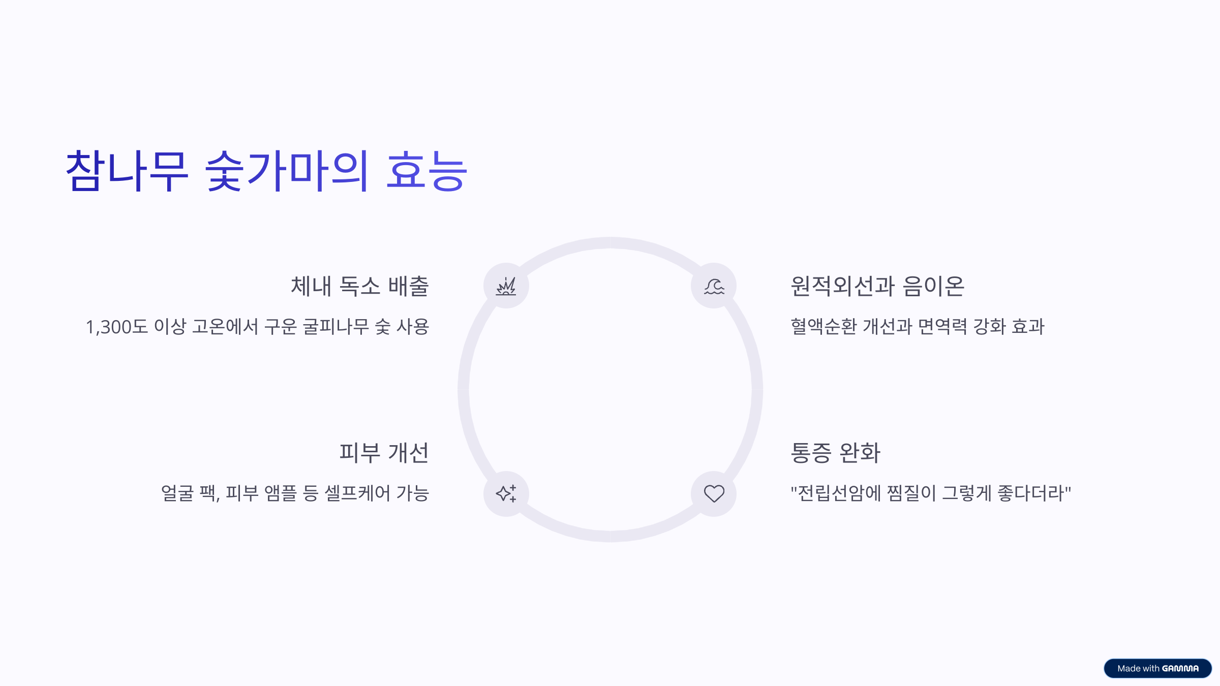 Q 여주참나무숯가마는 어떤 점이 특별한가요?1300도 고온에서 구운 굴피나무 숯과 전통 숯가마 찜질이 특징입니다. 원적외선, 음이온의 효과로 건강에 좋다는 후기가 많아요.