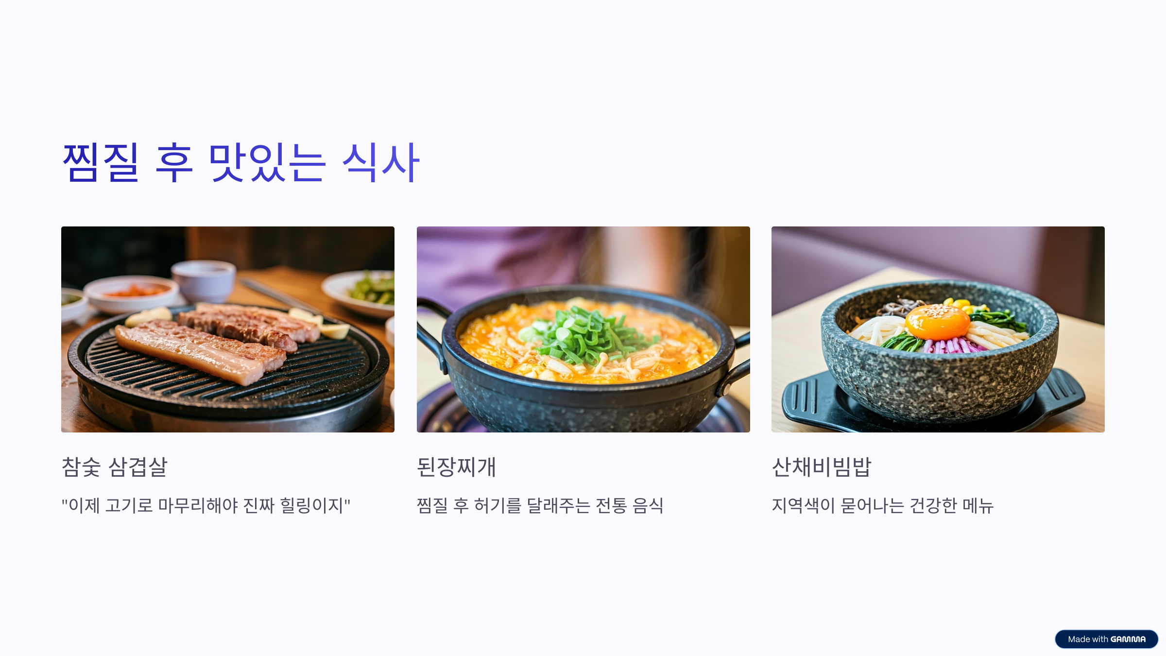 A 찜과 삼겹살의 환상 콜라보찜질로 피로를 풀고 나면 삼겹살 한 입이 천국입니다. 특히 직접 참숯에서 구운 고기는 향도 풍부해요.