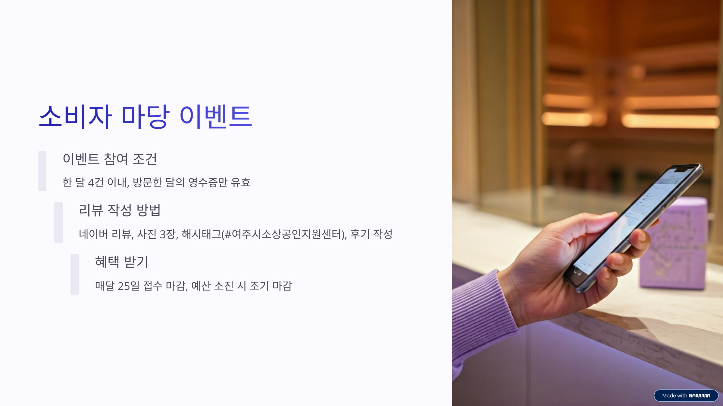 항목 내용 신청 가능 건수 월 최대 4건 필수 조건 영수증, 사진 3장, 해시태그 필수 접수 마감 매달 25일 네이버 리뷰 + #여주시소상공인지원센터 해시태그만 남기면 참여 완료! 신청은 홈페이지 회원가입 후 게시물 작성으로 가능하니,