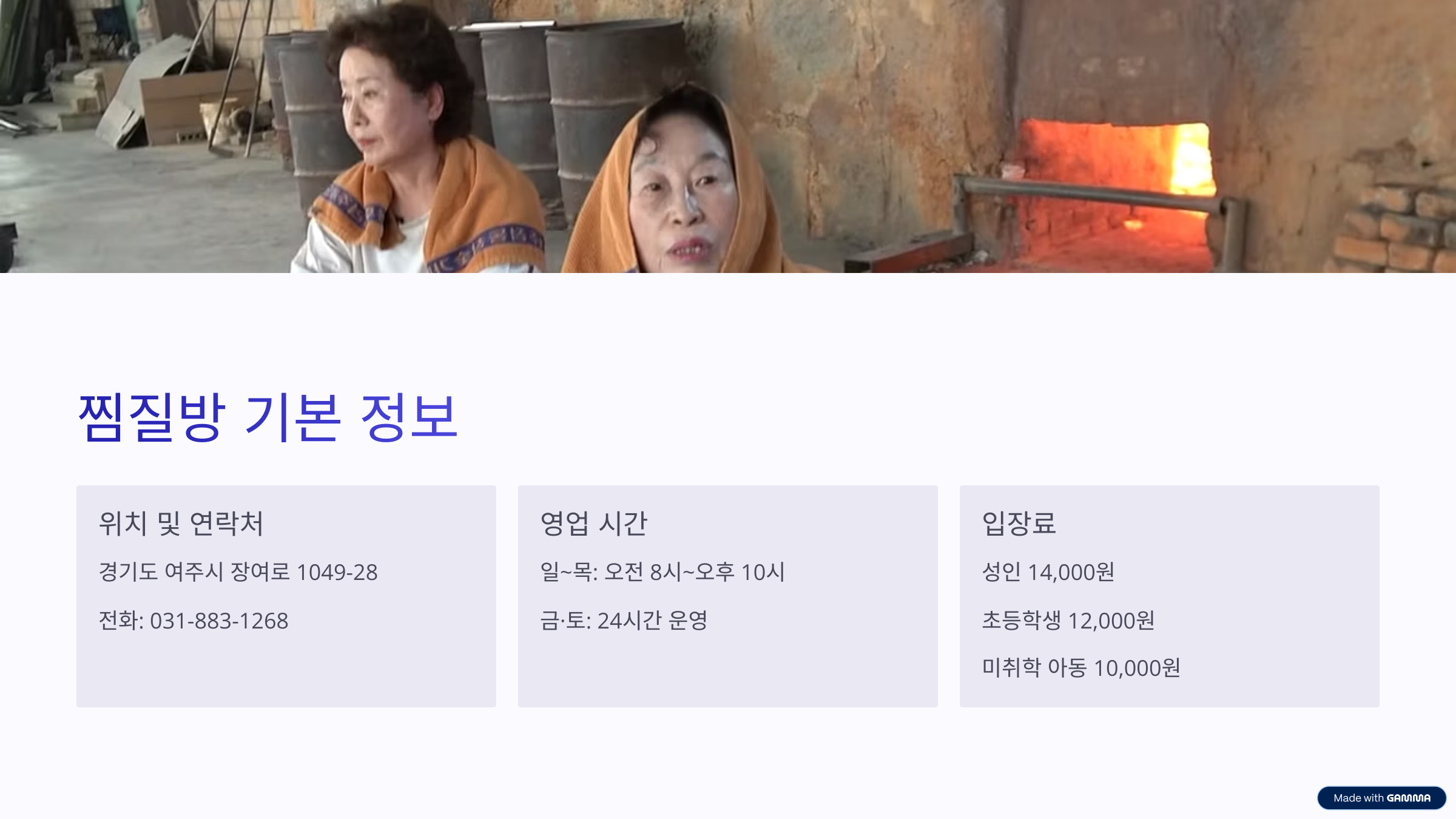 Q 찜질방 이외에 어떤 서비스가 있나요?식사 가능, 와이파이 무료, 숯 판매 등 부가 서비스가 다양하게 마련되어 있습니다.