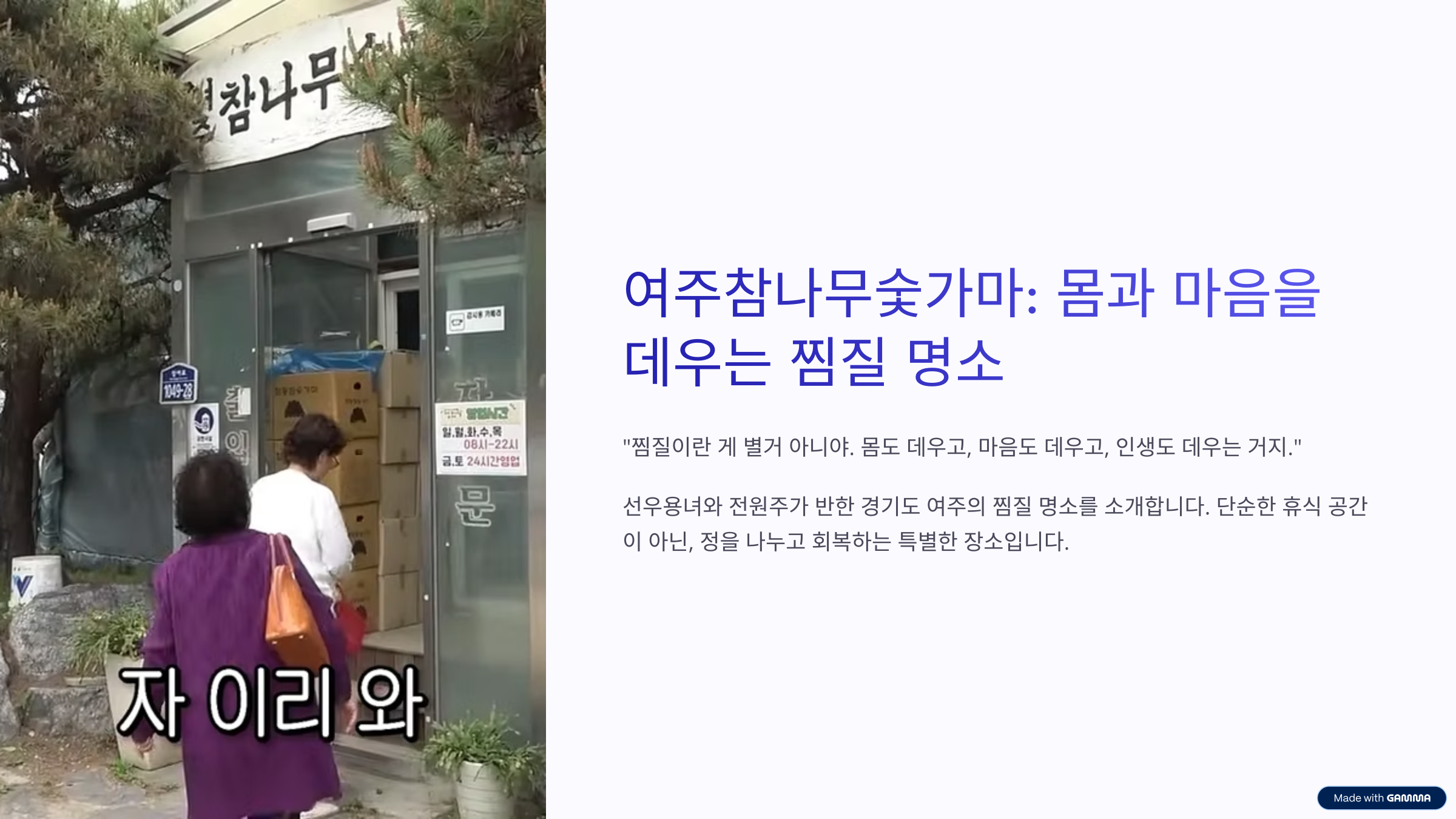 여주참나무숯가마는 단순한 찜질방을 넘어, 추억과 여유, 힐링이 공존하는 공간이었습니다. 특히 선우용녀와 전원주 선생님의 유쾌하고도 깊이 있는 대화를 통해, 삶을 바라보는 시선까지 달라졌어요. 여러분도 바쁜 일상 속에서 자신을 위한 하루, 자연과 숯의 따뜻함에 몸을 맡겨보는 건 어떨까요? 지금 이 순간이 가장 젊은 날이니까요!